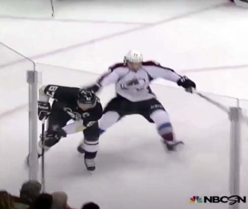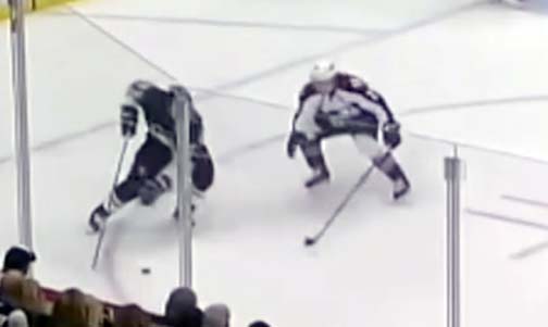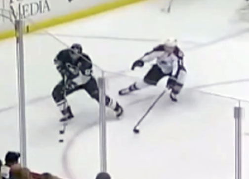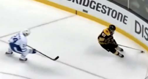 Следующий эпизод, конечно, лучше смотрится в динамике. Кросби завершил обманное движение и теперь вновь работает на внешнем ребре левой ноги и внутреннем правой. Он использует инерцию импульса движения вперёд и отталкивание правой ногой для отрыва от МакКиннена. Продолжая, при этом, укрывать шайбу корпусом.
