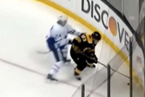 Разбирая этот эпизод, необходимо отметить, что на первом фото Маршан использует для движения внутреннее ребро правого конька и внешнее ребро левого. На фото №2 он «оттормаживается» и уже в работе находятся левое внешнее и правое внутреннее ребра его коньков. Что очень важно, вес тела перенесён на левую ногу, она согнута примерно на угол 100-110 градусов. На фото №3 всё возвращается на круги своя. Лезвие левой ноги на внешнем ребре, правой, на внутреннем. На всех трёх фото видно, что Маршан находится на достаточном расстоянии от борта, чтобы совершить необходимые ему манёвры. Используя инерционный импульс движения, а так же энергию переданную ему соперником в момент соприкосновения, Брэд Маршан уходит с ускорением по свободному льду, чтобы отдать партнёру голевую передачу.