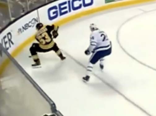 На что хотелось бы ещё обратить ваше внимание. Хороший нападающий всегда контролирует положение ног и корпуса защитника. На следующих фотографиях обратите внимание на то, как это делает Брэд Маршан.