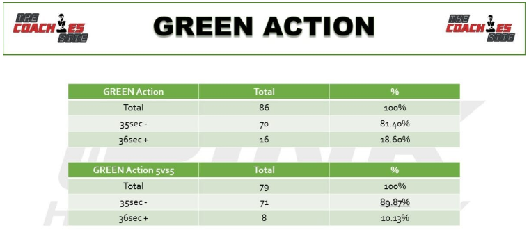 Грамотные действия игрока, почти наверняка закончатся «зелёным броском», именно от таких бросков исходит наибольшая угроза воротам, но в обоих оставшихся аспектах нашего анализа, цифры недвусмысленно указывают на то, что наибольшее количество результативных действий, игрок совершает в первые 35 секунд своего нахождения на площадке, во время очередной игровой смены.