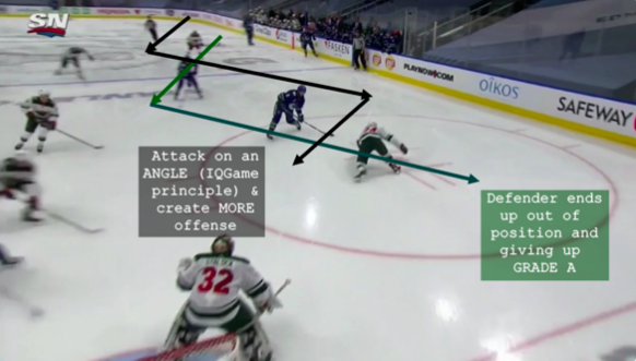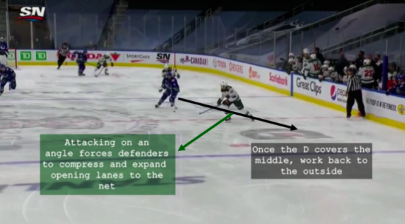 Уж на что «быстр» в игре Коннор МакДэвид, но он по-прежнему использует этот принцип для последовательного создания времени и пространства. Вот пример атаки с изменением её направления из игры сезона 2020 года, между "Ванкувер Кэнакс" и "Миннесота Уайлд".