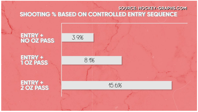 В 2016 году, Райан Стимсон расширил исследования Тульского и других аналитиков, установив, что на процент результативного завершения контролируемого входа в зону, напрямую влияет и количество точных передач партнёрам при развитии атаки в зоне соперника. Чем их больше, тем выше процент завершения атакующих действий броском в створ ворот.