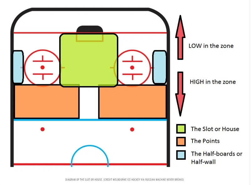 Обратите внимание на крайнего нападающего противоположного фланга «Айлендерс». Пока партнёры отрабатывают в углу, сдерживая нападение «Вашингтона», он перекрывает любую возможность передачи в центр, надёжно закрыв зону слота.