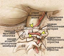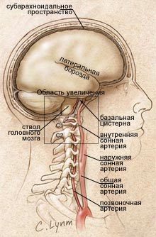 К сожалению мягкий "ошейник", который носят хоккеисты для защиты шеи не спасает при попадании шайбы. Удар шайбы в шею может вызвать тупую травму мягких тканей, травмы гортани и шейных позвонков, а также разрывы кровеносных сосудов, которые являются очень опасными и могут привести к внезапной смерти спортсмена. Так произошло с 11-летним хоккеистом Сашей Графкином, который погиб 14 сентября 2007 года - не помог даже защитный «ошейник» - шайба ударила как раз там, где он заканчивался. В литературе описывается 6 подобных случаев со смертельным исходом, произошедших в США с хоккеистами-любителями. Средний возраст пострадавших составлял 17 лет (от 9 до 30 лет), удар шайбой приходился по шее справа или слева, но всегда локализовался под нижней челюстью, между "ошейником" и шлемом. В пяти случаях фатальные удары были нанесены шайбой (4 из них на льду во время игры и 1 на скамейке запасных) и один удар был нанесен кулаком во время драки. Во всех 6 случаях смерть наступала мгновенно и реанимационные действия были бесполезны. Аутопсия показала, что смерть была вызвана разрывом позвоночной артерии (n=4) или внутренней сонной артерии (n=1) (в еще одном случае точное месторасположение разрыва установить не удалось), который приводил к интенсивному субарахноидальному кровотечению с быстрым накоплением крови в базальной цистерне, латеральной борозде и желудочках мозга с образованием грыжи ствола головного мозга (рис. 4). Сдавление ствола головного мозга, в котором находятся дыхательный и сердечно-сосудистый центры, приводит к остановке дыхания и сердцебиения. Наиболее вероятные места разрыва позвоночной артерии находятся в местах ее фиксации, а именно в отверстии поперечного отростка, при прохождении через заднюю атланто-затылочную мембрану и твердую мозговую оболочку - на рисунке эти места указаны желтыми стрелками (рис. 4).