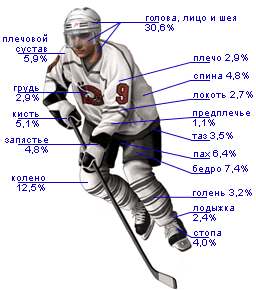 На рисунке 1 изображены данные шведского исследования, в котором на долю нижних конечностей приходилось 39,4% травм, на голову, лицо и шею 30,6% травм, на верхние конечности - 22,3%. В датском исследовании также чаще всего травмировались голова, лицо и шея, повреждения которых составляли треть всех травм (28%), а травмы нижних конечностей составляли вторую треть травм (27%), травмы верхних конечностей составляли 19% от всех травм. В другом, менее репрезентативном американском исследовании, опубликованном в 2005 году травмы головы, верхних и нижних конечностей распределились следующим образом - 35%, 21% и 24% соответственно. Результаты японских исследователей несколько отличны от предыдущих - самой распространенной травмой среди японских хоккеистов были повреждения нижних конечностей (43%), среди которых наиболее травмируемым участком было колено (9,4% от общего количества травм). На втором месте стояли травмы верхних конечностей (27,6%), среди которых чаще всего травмировались кисть с пальцами (8,2% от общего количества травм) и плечо (5,6% от общего количества травм). Травмы головы, лица и шеи стояли на третьем месте и составили 16,9%.