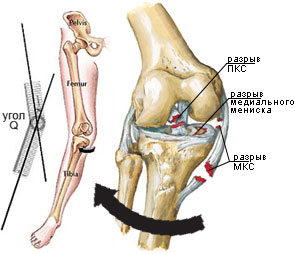 Коленные суставы хоккеистов во время игры находятся в полусогнутом положении, что увеличивает их уязвимость к повреждениям. В случае удара в латеральную часть коленного сустава действует вальгусная внешняя вращающая нагрузка, что может привести к повреждению медиальной коллатеральной и передней крестообразной связок (рис. 9). Изолированный разрыв медиальной коллатеральной связки можно лечить неоперативным путем. Повреждение передней крестообразной связки нередко сопровождается немедленной отечностью коленного сустава. В случае разрыва передней крестообразной связки может возникнуть рецидивирующая нестабильность коленного сустава: увеличивается риск разрывов мениска и повреждений суставных поверхностей. Рецидивирующая нестабильность требует коррекции хирургическим путем. В то же время функциональная нестабильность вследствие повреждения передней крестообразной связки у хоккеистов встречается редко. Лечение рецидивирующей нестабильности вследствие повреждения передней крестообразной связки чаще всего предусматривает замену разорванной связки аутогенной тканью. В качестве трансплантата используют среднюю треть сухожилия надколенника.