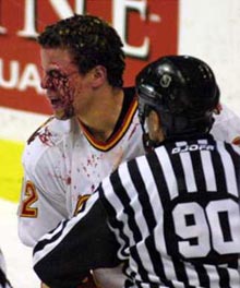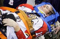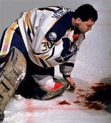 Для защиты головы от повреждений хоккейные шлемы стали делать более тяжелыми. Было предположение, что это послужило причиной увеличения числа повреждений шейного отдела позвоночника. Чтобы выяснить, насколько влияет ношение шлема на изменение величины нагрузки на участок головы и шеи, а также на предрасположенность к повреждениям шейного отдела позвоночника, было изучено изменение динамики головы при ношении шлема. В результате никаких различий в динамике головы при использовании и неиспользовании шлема не выявлено. Травма шеи может возникнуть вследствие непосредственного ушиба латеральной части шейного отдела позвоночника, вызывая неврапраксию корешков шейных нервов или верхнего ствола плечевого сплетения. Игрок испытывает сначала боль в области плеча, затем появляется чувство жжения в области шеи и плеча и слабость мышц, иннервируемых корешками нервов С5 и С6. Двигательный дефицит обычно быстро проходит, однако возвращение к обычному уровню активности следует отложить до исчезновения всех неврологических признаков и проведения рентгенографического обследования шейного отдела позвоночника. Если хоккеист не уделяет должного внимания защите шеи и горла, то возникает риск очень опасных травм шеи лезвием конька. Vergis и соавторы описывают три случая травм шеи коньком в любительском хоккее - два из них привели к смерти спортсменов. Один из них скончался из-за вторичной асфиксии в следствии чрезмерного кровотечения в дыхательные пути, вторая смерть произошла из-за сильной потери крови в следствии рассечения сонной артерии. Самый известный случай травмы шеи коньком произошел с голкипером Клинтом Маларчуком 22 марта 1989 года, который транслировался по центральному телевидению (рис. 3). Благодаря быстрым и грамотным действиям командного врача Маларчук остался жив и вышел на лед в том же сезоне. После этого случая все вратари начали использовать дополнительную защиту шеи.