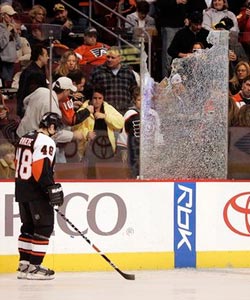 Другим источником повреждений является шайба. Хоккейная шайба изготавливается из жесткой вулканизированной резины или другого одобренного ИИХФ материала, ее масса составляет 170 г, диаметр 7,62 см, толщина 2,54 см. Скорость ее у профессиональных игроков достигает 192 км/ч и более 80 км/ч у молодых хоккеистов. Максимальная сила воздействия шайбы на максимальной скорости составляет 567 кг. Этой силы достаточно, чтобы разбить крепкие полимерные щиты толщиной в несколько сантиметров, которые устанавливаются на площадке для защиты зрителей (рис.2). Установлено, что при скорости шайбы 80 км/ч визор, защищающий лицо игрока, деформируется, а при скорости 96 км/ч он деформируется настолько, что входит в контакт с лицом. Также не стоит забывать, что визор защищает только половину лица и такие участки, как зубы и нижняя челюсть особенно подвержены травмам, которые наносит летящая шайба. В этой связи весьма целесообразно, чтобы молодые хоккеисты носили специальные железные маски, защищающие все лицо.