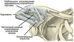 Повреждения плечевых суставов довольно часто встречаются в хоккее. Наиболее типичной травмой являются повреждения связок акромиально-ключичного сустава (рис. 7). При растяжении акромиально-ключичного сустава I степени у игрока возникает боль, однако он нередко способен закончить матч. При повреждении акромиально-ключичного сустава II и III степени пропуск тренировочных занятий составляет 2—6 недель. Полное смещение дистальной части ключицы требует хирургического вмешательства.