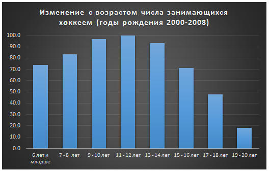 Если рассмотреть долю от максимального числа мальчиков занимающихся хоккеем для каждого года рождения, то максимум приходится на возраст 11-12 лет, около 70% детей начинают заниматься в возрасте 5-6 лет, к 17-18 годам в хоккее остается 49% от начинавших заниматься.