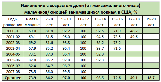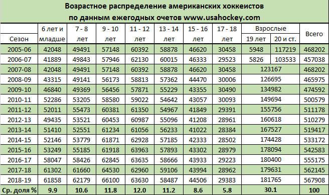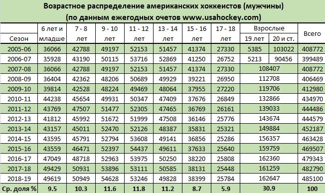 Статистика по 19 летним приведена только в двух самых ранних отчетах за сезоны 2005-2006 и 2006-2007. Если в 2006 году 17-18 летних игроков было 27330, то в сезоне 2007 игроков возраста 19 лет осталось лишь 5213. Можно грубо подсчитать, что во взрослый хоккей переходят около 19% от занимавшихся в детстве.