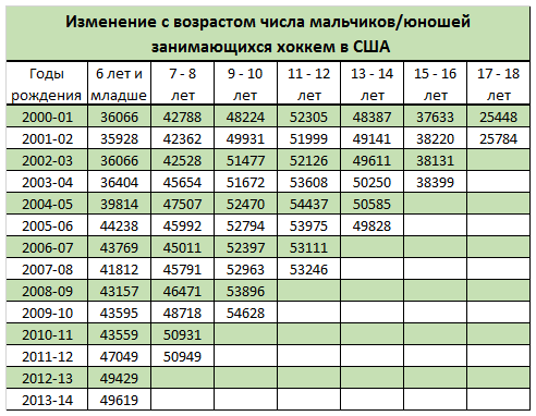 Например, по итогам сезона 2005-2006 было учтено 36066 хоккеистов возраста 5-6 лет т.е. 2000-2001 года рождения соответственно, после сезона 2007-2008 эти мальчишкам стало по 7-8 лет и общее число игроков 2000-2001 годов рождения составило 42788, максимальное число занимающихся для этих годов рождения было в возрасте 11-12 лет в сезоне 2011-2012 и составило 52305 игроков, далее со взрослением идет уменьшение занимающихся и к возрасту 17-18 лет остается лишь 25448 юниоров в сезоне 2017-2018.