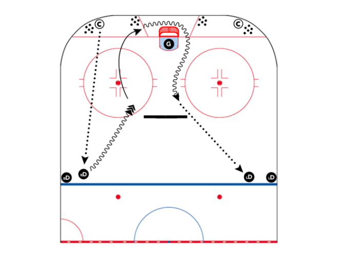 - Тренер делает передачу на игрока, расположившегося на синей линии. Этот защитник движется по синей линии со смещением в центр, совершает обманное движение направленное в середину слота, и выходит из обманного манёвра с перемещением веса тела на противоположную направлению манёвра опорную ногу, (ближнюю к шайбе), совершая резкий кистевой бросок по воротам, без замаха.