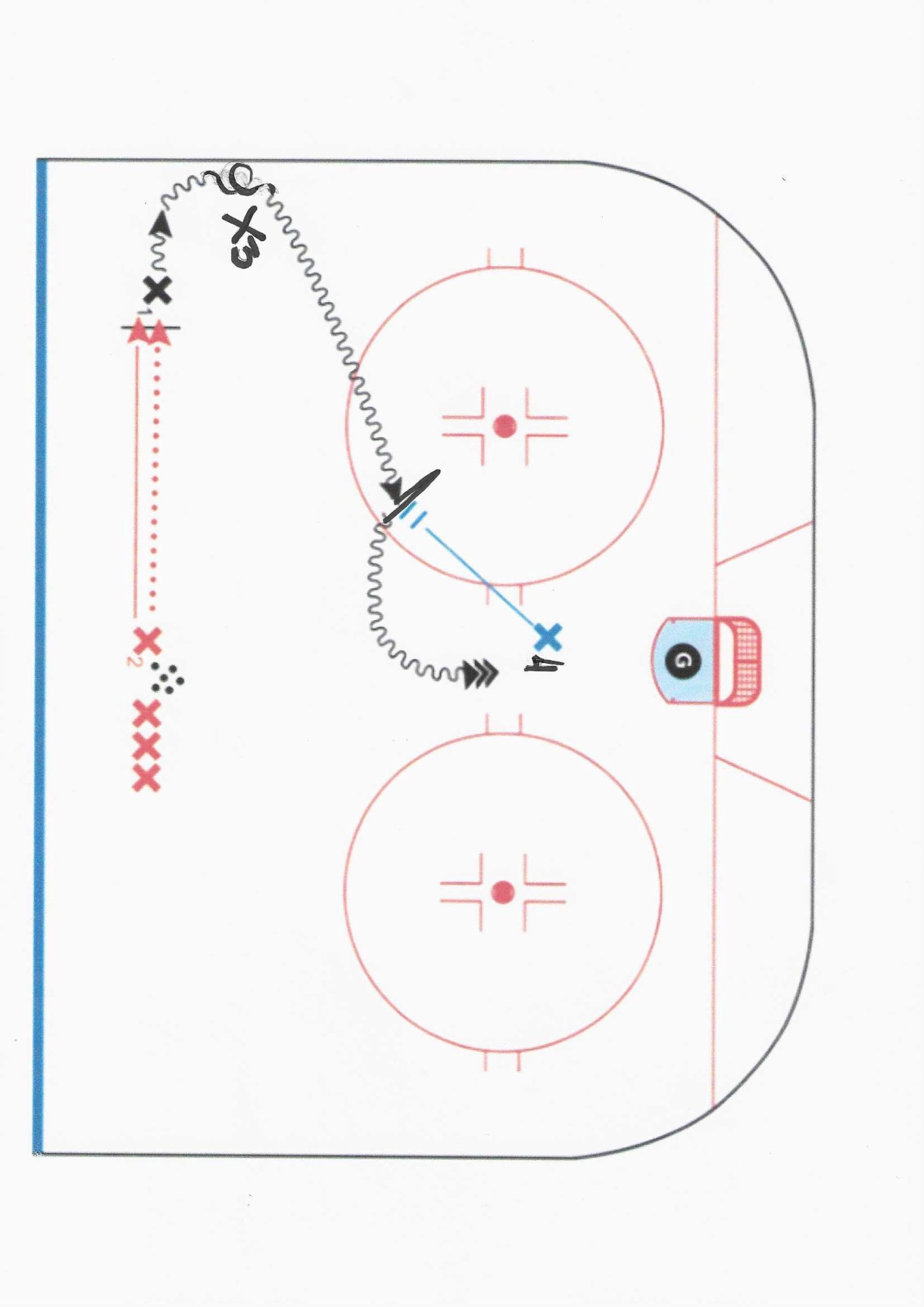 - После выполнения упражнения и игры на отскоке шайбы, игрок №1 занимает место игрока №4, игрок №4 занимает место игрока №3, игрок №3 переходит на место игрока №2, а игрок №2 выполняет функции игрока №1.