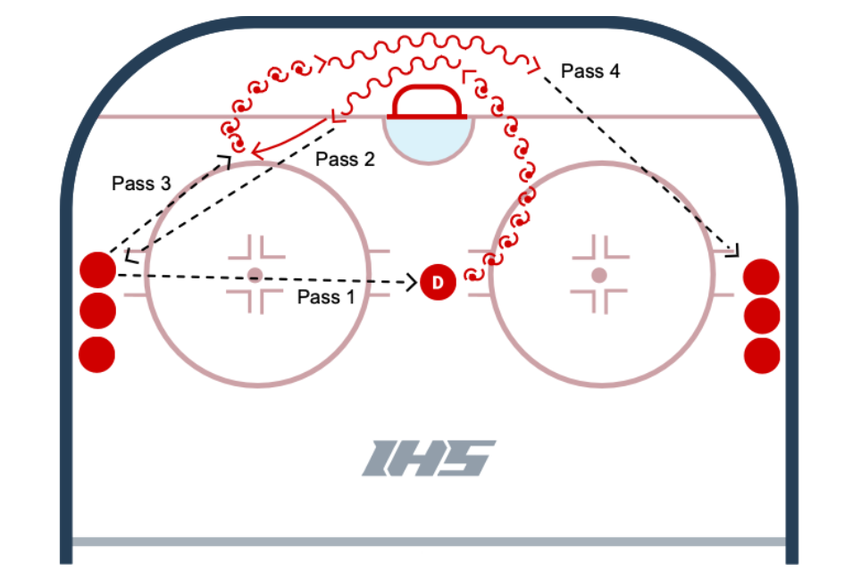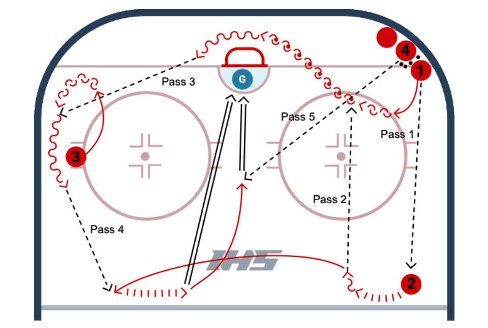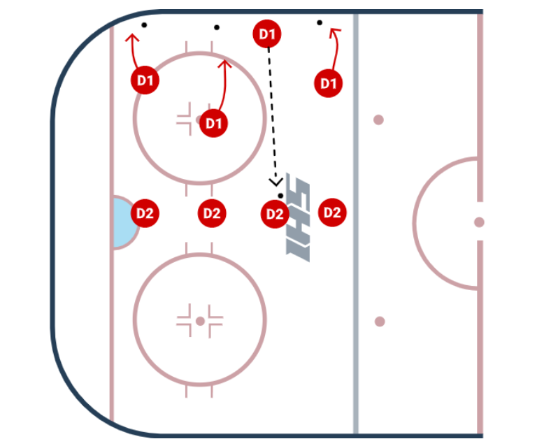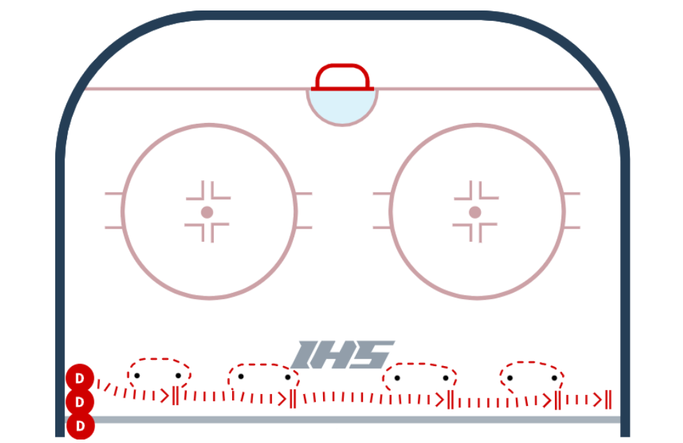 Игроки разделены на две группы и располагаются на полборта в зоне защиты, напротив друг друга. Для начала упражнения игрок №1 выкатывается на середину слота и получает передачу от игрока №2. После чего игрок №1 начинает движение спиной вперёд, владея шайбой и опускаясь до лицевой линии со стороны ближней штанги от точки старта. За лицевой линией игрок №1 переключается на движение лицом вперёд, огибает ворота, и пасом от лицевой линии находит игрока №2, находящегося на полборта в колонне напротив. Отдав передачу, игрок №1 делает переключение на движение спиной вперёд со сменой направления движения, получает ответную передачу от игрока №2 и сделав ещё одно переключение на движение лицом вперёд, огибает ворота и находит передачей игрока стоящего в линии ожидания на позиции игрока №1.