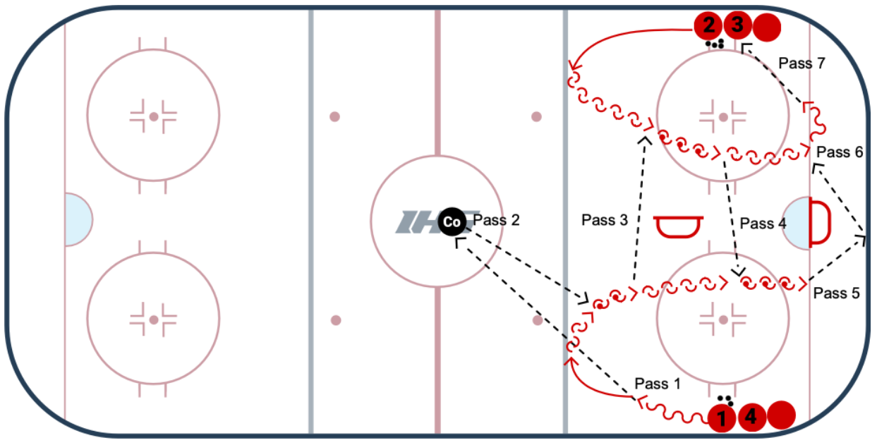 Игрок №1 принимает шайбу, разворачивается лицом к лицевой линии и делает передачу с отскоком от борта в направлении игрока №2, который приняв передачу, отдаёт шайбу на полборта, где на линии ожидания её принимает второй №2 и начинает своё упражнение через пас на тренера.