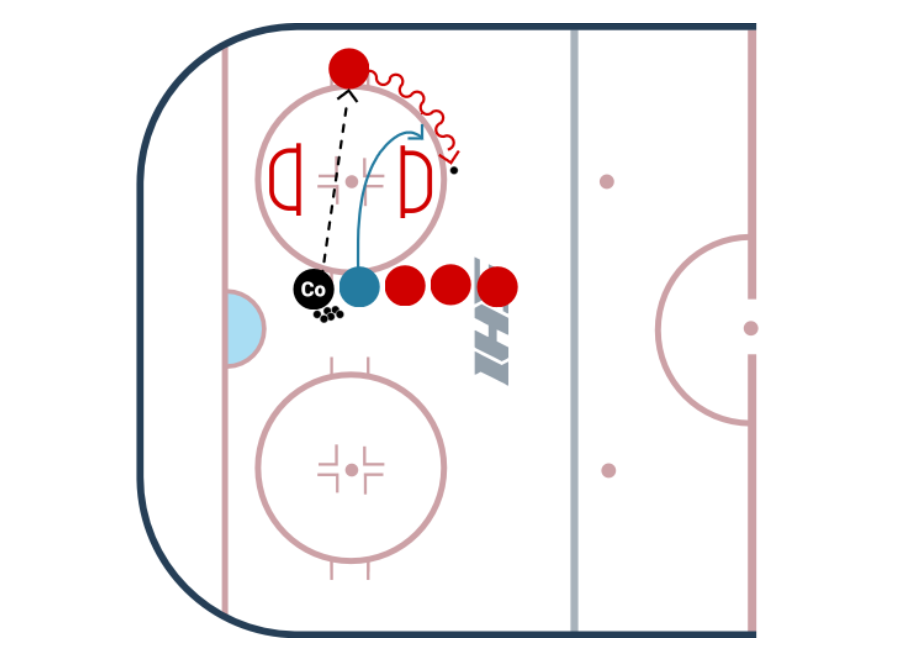 - Акцентируйте внимание игроков на сканировании игрового пространства перед подбором шайбы. Даже выполняя упражнение без противодействия, игроки должны помнить, что в игровых реалиях, они столкнутся с жёстким бэкчекингом со стороны соперника.