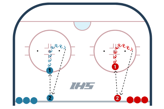 По сигналу тренера игрок №1 владея шайбой начинает движение в сторону синей линии с направлением в центр, и делает передачу на тренера, который занимает позицию в центре площадки, примерно напротив точки вбрасывания в центральном круге.
