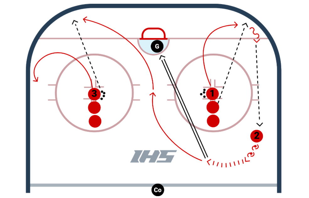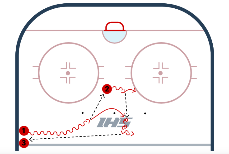 Перед началом упражнения игроки №1 и №2 располагаются в одной колонне, а игрок №3 во второй колонне. Игрок №2 набрасывает шайбу на лицевой борт и открывается на полборта для получения передачи. Игрок №1 подбирает шайбу, начинает движение и делает передачу на игрока №2, который получив пас, смещается, двигаясь спиной вперёд по направлению к синей линии, далее «натягивает» шайбу перемещаясь приставным шагом вдоль синей линии и совершает бросок по воротам, после чего стартует в сторону противоположного закругления длинного борта, подбирает свободную шайбу и отдаёт передачу на игрока №3, который также открывается на полборта, и упражнение продолжается как «поточное».