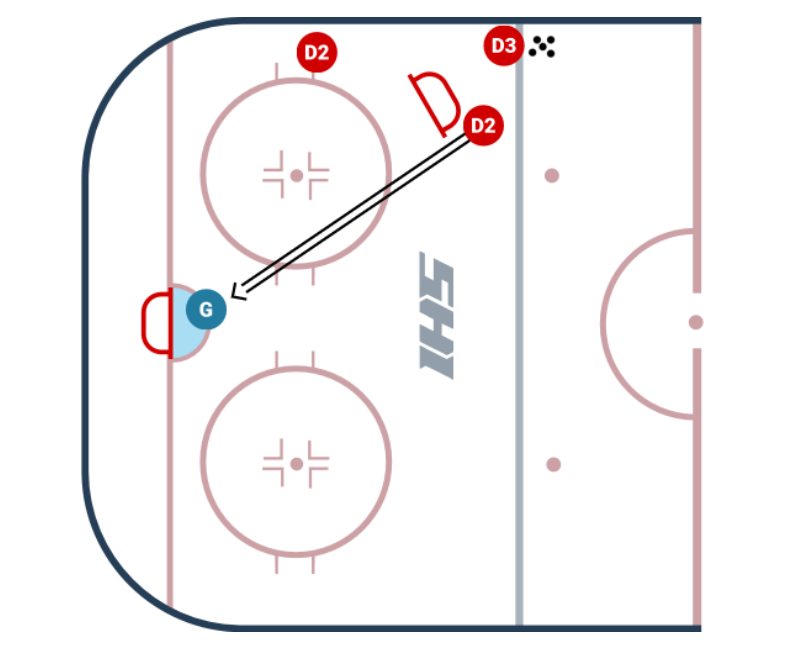 Игрок №2, получив передачу от игрока №1, смещается по синей линии приставным шагом в сторону слота, делает ответную передачу, и двигается поперёк зоны соперника вдоль синей линии, лицом вперёд. После того, как игрок №3 получает шайбу от игрока №1 и переходит на движение лицом вперёд, игрок №2 принимает от него передачу и сделав переход двигается приставным шагом в сторону вершины слота, «натягивая» шайбу под бросок по воротам, наносит его. Во второй модификации упражнения, игрок №2 получает ещё одну передачу под бросок, на этот раз от игрока №4, стоящего в линии ожидания игрока №1. После выполнения упражнения, игрок №2 встаёт на линию ожидания игрока №1.