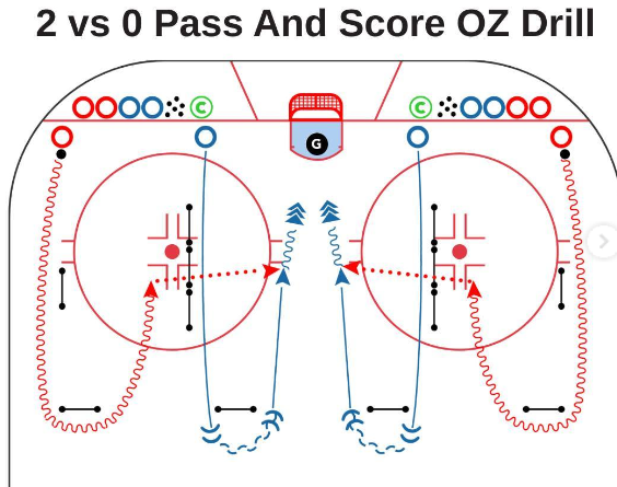 Получив шайбу, игроки совершают выход 2 на 0, отрабатывая своё взаимодействие в зоне атаки, после пересечения её синей линии.