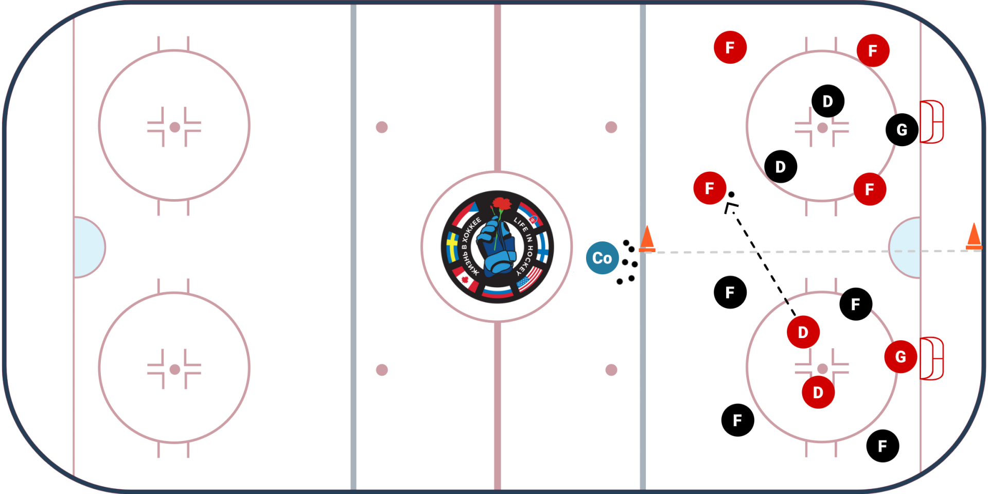 Одна из зон защиты хоккейной площадки, делится вертикально на две равные части. На одной стороне разделённой зоны будут играть четыре игрока в тёмных джерси (нападающие), и два в светлых (защитники), на второй наоборот, четыре в светлых и два в тёмных.