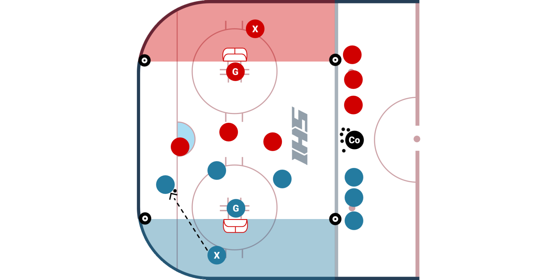 - После потери или перехвата шайбы, игроки противоположной команды точно также, первым делом делают передачу на своего «Бурка», после чего ведут перегруппировку на начало атаки.