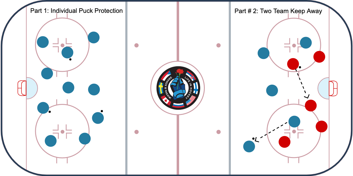 В зависимости от возраста и уровня мастерства ваших игроков, тренеры могут модифицировать это упражнение, чтобы сделать его более легким, добавив больше шайб или уменьшив количество участвующих игроков.