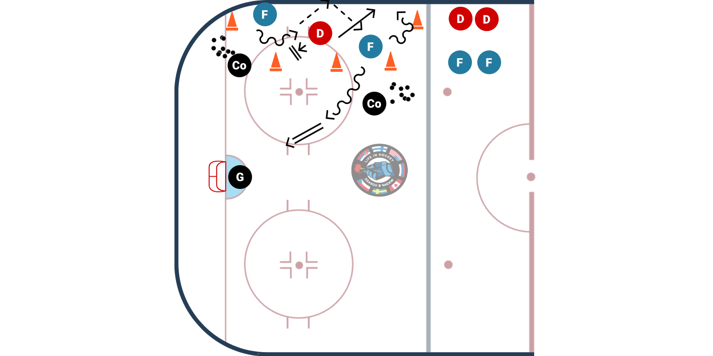 Цель игры заключается в том, чтобы нападающие сделали 4 передачи подряд. Если им это удается, они выигрывают и получают право бросить по воротам. Если защитник отбирает шайбу или шайба выходит за пределы площадки, выигрывает защитник и уже он получает право на бросок по воротам.