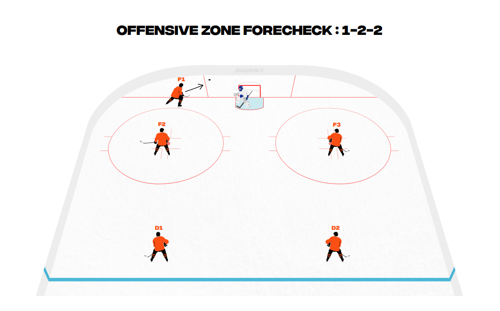 Классическая схема давления 1-2-2, требует очень активных и агрессивных действий от F1, чтобы навязать мощное противоборство игроку соперника, владеющему шайбой, или стремящемуся к её подбору. Задача прессингующего поставить игрока соперника в наименее выгодную для него игровую позицию. При этом F2 и F3, одним игроком накрывают второго защитника, а вторым занимают позицию опорного игрока на сильном фланге. В случае неконтролируемого отброса шайбы соперником, с целью вывести её из зоны, или перевести её короткой передачей вдоль борта на свободного партнёра, а так же в случае неконтролируемого отскока или рикошета шайбы в борьбе с соперником, её подбор осуществляет защитник сильного фланга, задача которого закрыть ближний длинный борт и синюю линию зоны атаки.