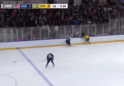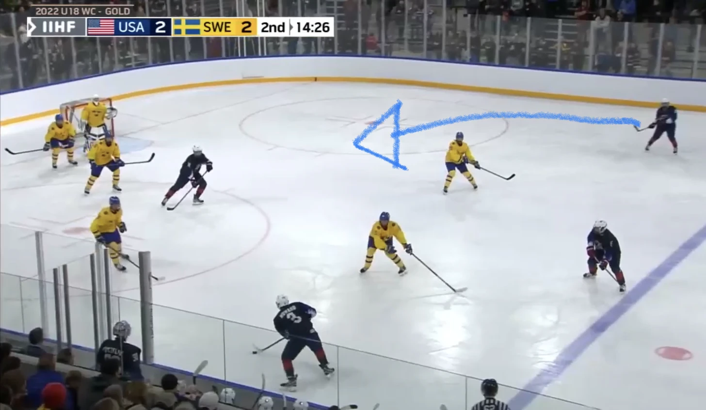 В представленном ниже видео фрагменте, минимальное движение Кейси позволяет сопернику блокировать свободную зону, а вместе с ней и все возможности продолжения атаки, кроме передачи вдоль синей линии на партнёра по обороне. И если бы вингер слабого фланга шведской сборной правильно оценил данный игровой эпизод, скандинавы вполне могли бы организовать перехват шайбы и контратаку на ворота сборной США